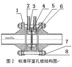 1、法蘭;2、導壓管;3、前環室;4、節流件;5、后環室;6、密封墊片;7、螺栓;8、螺母