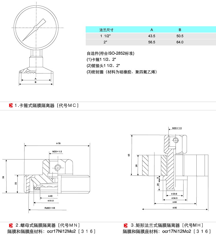 三、隔膜壓力表選型表:
