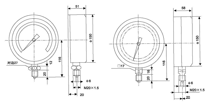 ○YB-150系列精密壓力表溫度影響:使用環境溫度如偏離20±3℃(A型)或20±2℃(B型)時,則須考慮溫度附加誤差0.4%/10℃