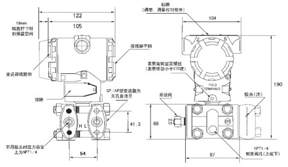 導壓連接:在壓力容室上連接螺孔為1/4-18NPT引壓接頭上的連接螺孔為1/2-14NPT, 其中心距為54mm,外形尺寸見下圖: